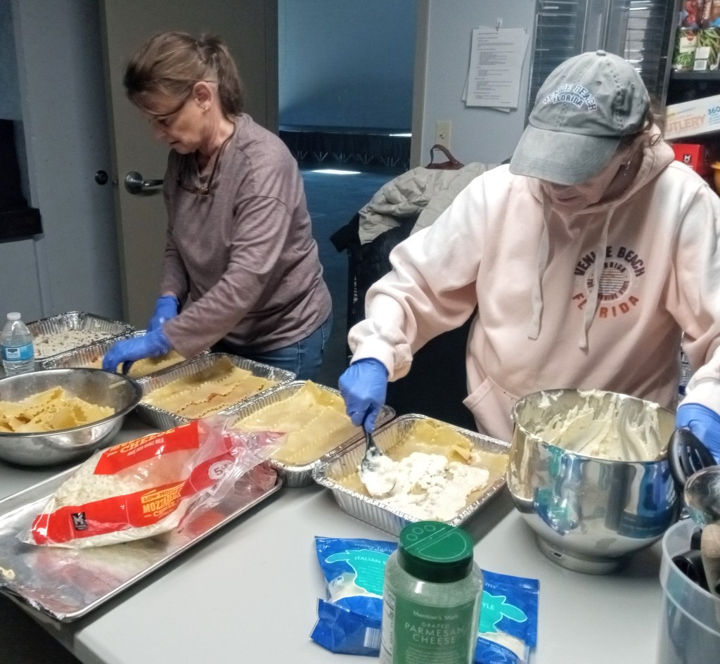 Mary and Judy work together to make multiple lasagnas in an assembly style at the Marylou Community Building in Truesdale. In January 2026, the Feeding on Faith community meal was lasagna, salad, garlic bread, and dessert. Photo credit: The Socialite_Amanda Bretz