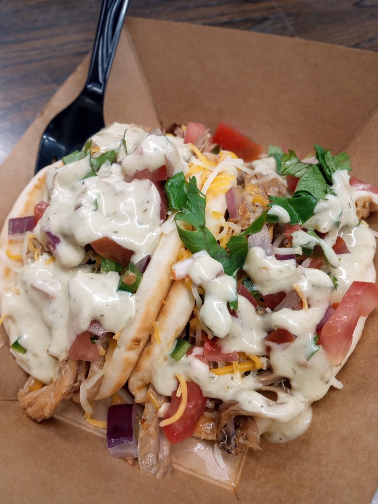 The soft shell is a bit sturdier, like a smaller version of pita bread, and that provided a solid structure for the jam-packed yumminess inside. Each taco shell contained a generous portion of pulled pork, that was then topped with shredded cheese, fresh pico de gallo, and crowned with an ample drizzle of an avocado ranch crema. Now, how to accurately describe all those flavors…
