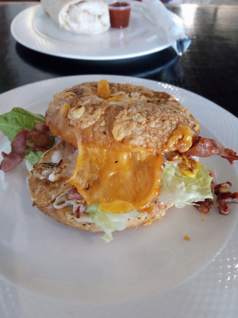 Although it’s really tasty, it’s so huge we always split the burrito. However, on our last visit, we deviated from this plan because the menu now features a housemade sourdough bagel sandwich. I couldn’t pass up the opportunity to try the sandwich made from a sourdough sharp cheddar bagel that has a fried egg, mayo, lettuce, bacon, and what I believe was cubed jamón, a dry-cured ham that is typically produced in Spain.