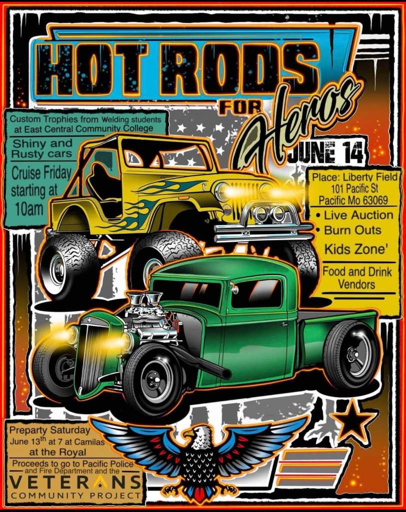 Hot Rods for Heroes, a 501-C3 organization with the goal of funding heroes through sharing the love of automobiles, is hosting a two day event in Pacific. Whether you want to show up for the car cruise on Friday or participate in the car show Saturday, there is something for everyone at this event. All proceeds for this event benefit the Pacific Police Department, Pacific Fire Department, and the Veterans Community Project.