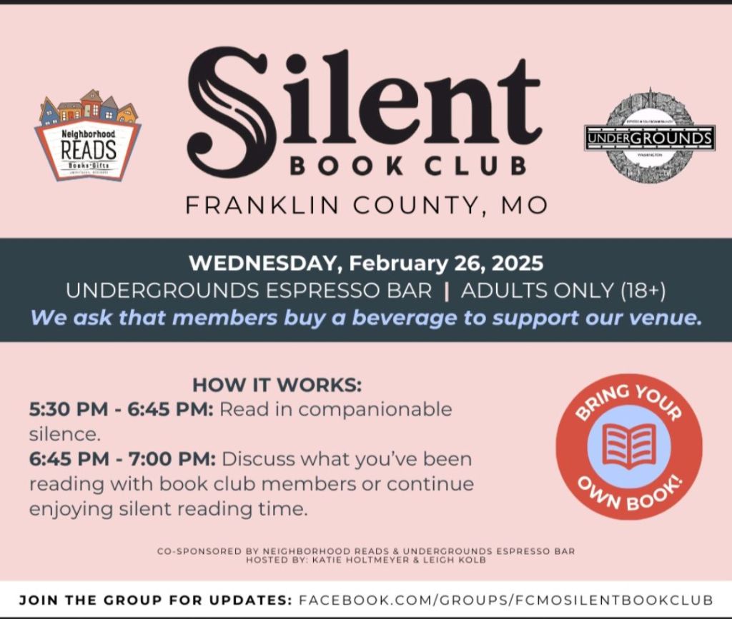 The Franklin County Silent Book Club is hosting its monthly meeting at underGROUNDS Espresso Bar in Washington. Bring your book of choice, order a beverage, and sit and read in companionable silence, followed by a short period dedication to conversation, or continued reading.