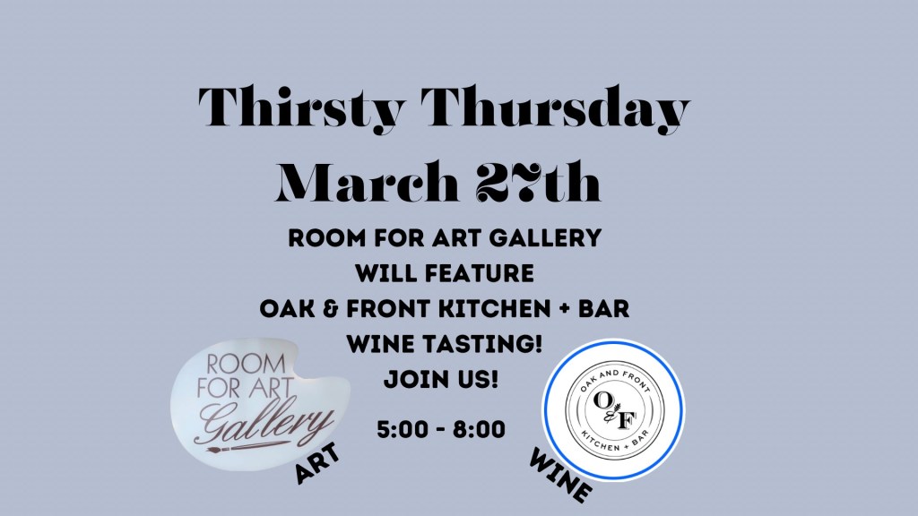 Thirsty Thursdays are back across downtown Washington and Room for Art Gallery is one of many businesses participating in downtown Washington’s Thirsty Thursday event! The Gallery will host Oak & Front Kitchen + Bar for a wine tasting.
