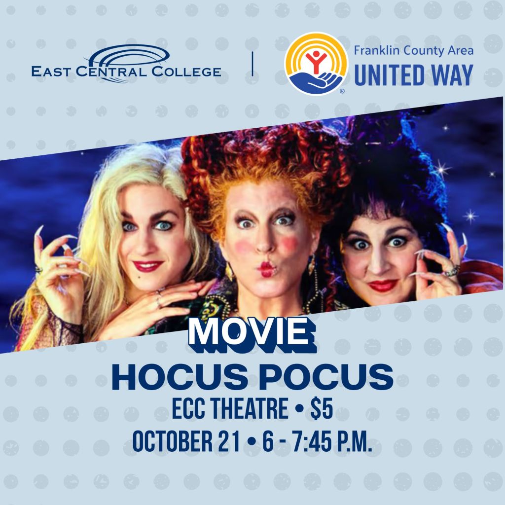 Head to East Central College for a fun, family-friendly showing of the movie “Hocus Pocus.” A suggested donation of $5 (to benefit United Way).