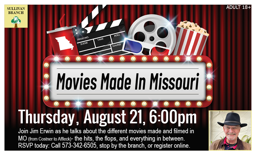 The Sullivan Branch of Scenic Regional Library is hosting a Movies Made in Missouri event at 6 p.m. Register for the event to learn about the films made in the Show Me State.