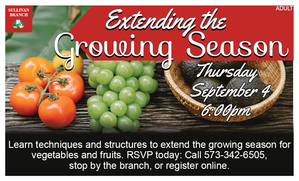 Are you looking for ways to extend the growing season in your vegetable garden? The Sullivan branch of Scenic Regional Library is having a program called Extending the Growing Season, at 6 p.m. The event is free, but RSVP is required to attend.