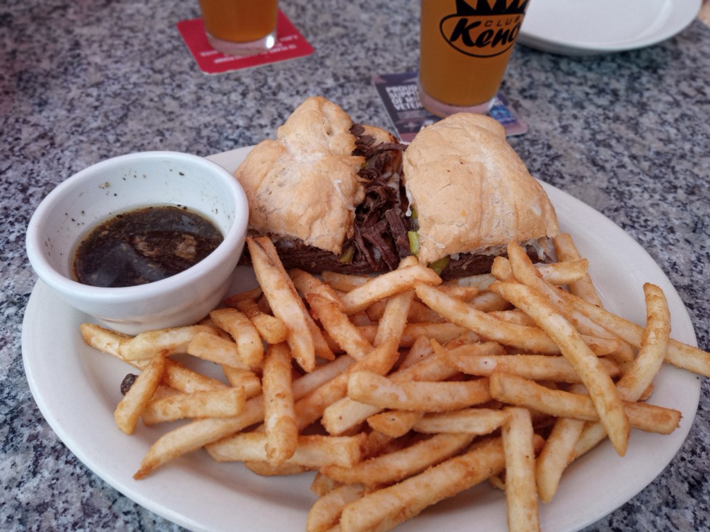 When it came to food, we decided to split that day’s special: an Italian beef sandwich served on garlic cheese bread, served with a side of au jus and we ordered the fries as our side. It was a pleasantly warm day, and since we’d decided to dine outside, we each had a beer to wash down our meal (it was an IPA from Mothers, and a perfect complement to the weather).