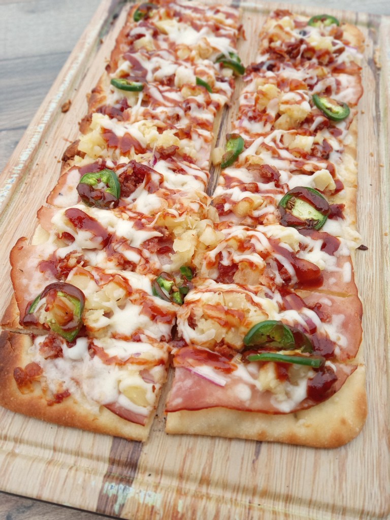 If you’re team “no pineapple on pizza” or can’t handle spiciness, don’t worry, there’s a few other flatbread selections that are topped with brisket, or Italian meats like salami, pepperoni, plus bacon, or the Portobello and bacon option.